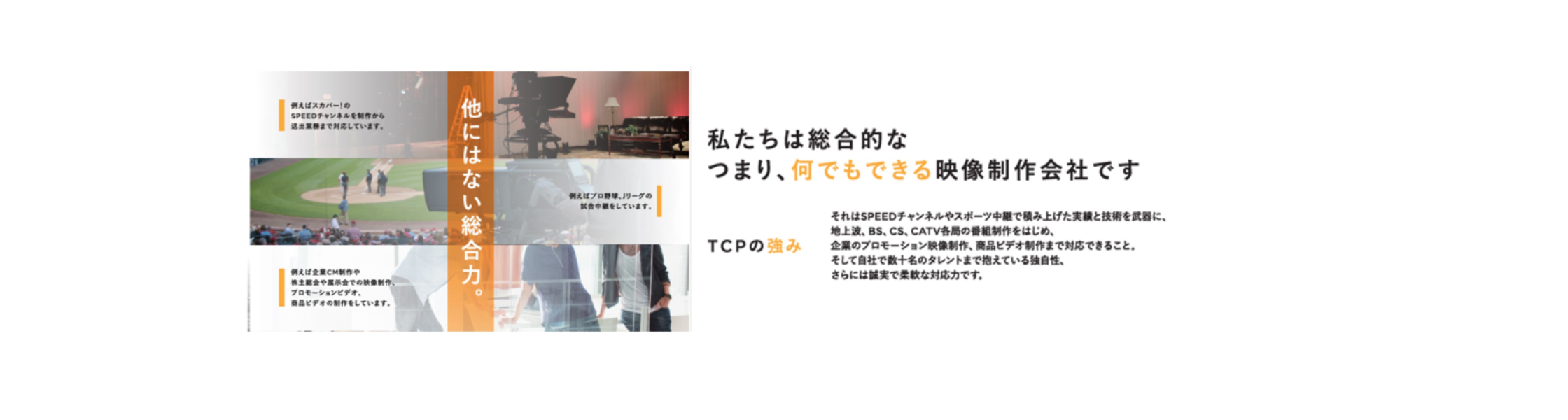 | 事業内容 | ・CS,CATV局の番組制作及びPV等の各種映像制作、並びに編集業務、 MCタレント派遣業務 ・ プロ野球、都市対抗野球、アメフト等、特に東京ドームでのスポーツ中継 ・ 競輪専門放送「SPEEDチャンネル」の制作・技術・送出業務 |