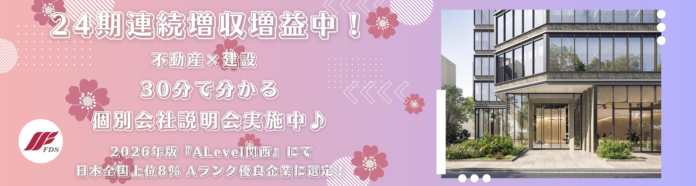 設立以来24期連続で増収・増益!不動産と建設のプロフェッショナルが集うFDSグループです。FDSでは土地の仕入れから、設計・施工・販売・管理までワンストップ体制で行う不動産デベロッパーで、年間約200棟施工施工している安定企業です。