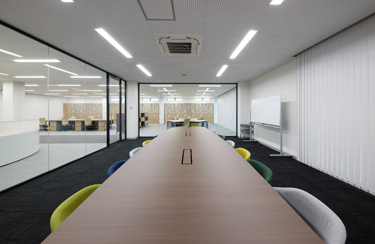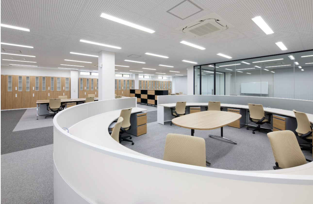 令和5年に新築移転した本社には、個々人に広々としたデスクスペースが確保され、快適に作業できる環境が整っています。パソコンは2画面で効率的に仕事が進められ、喫煙専用室や女性専用休憩室(更衣室)も完備しています。