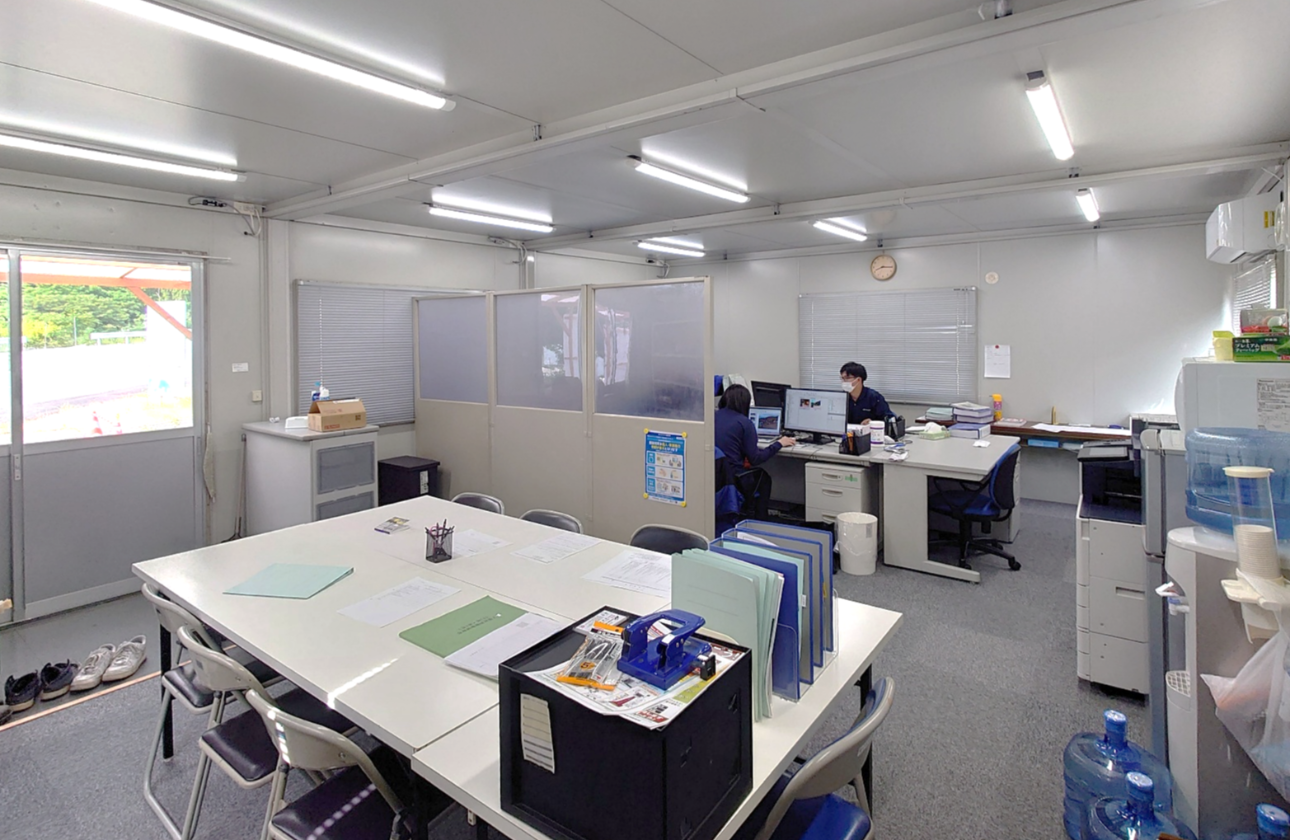 建物自体は簡素な作りですが、設備もスペースも十分に整っています。奥は作業用、入り口側は打合せ用の机です。