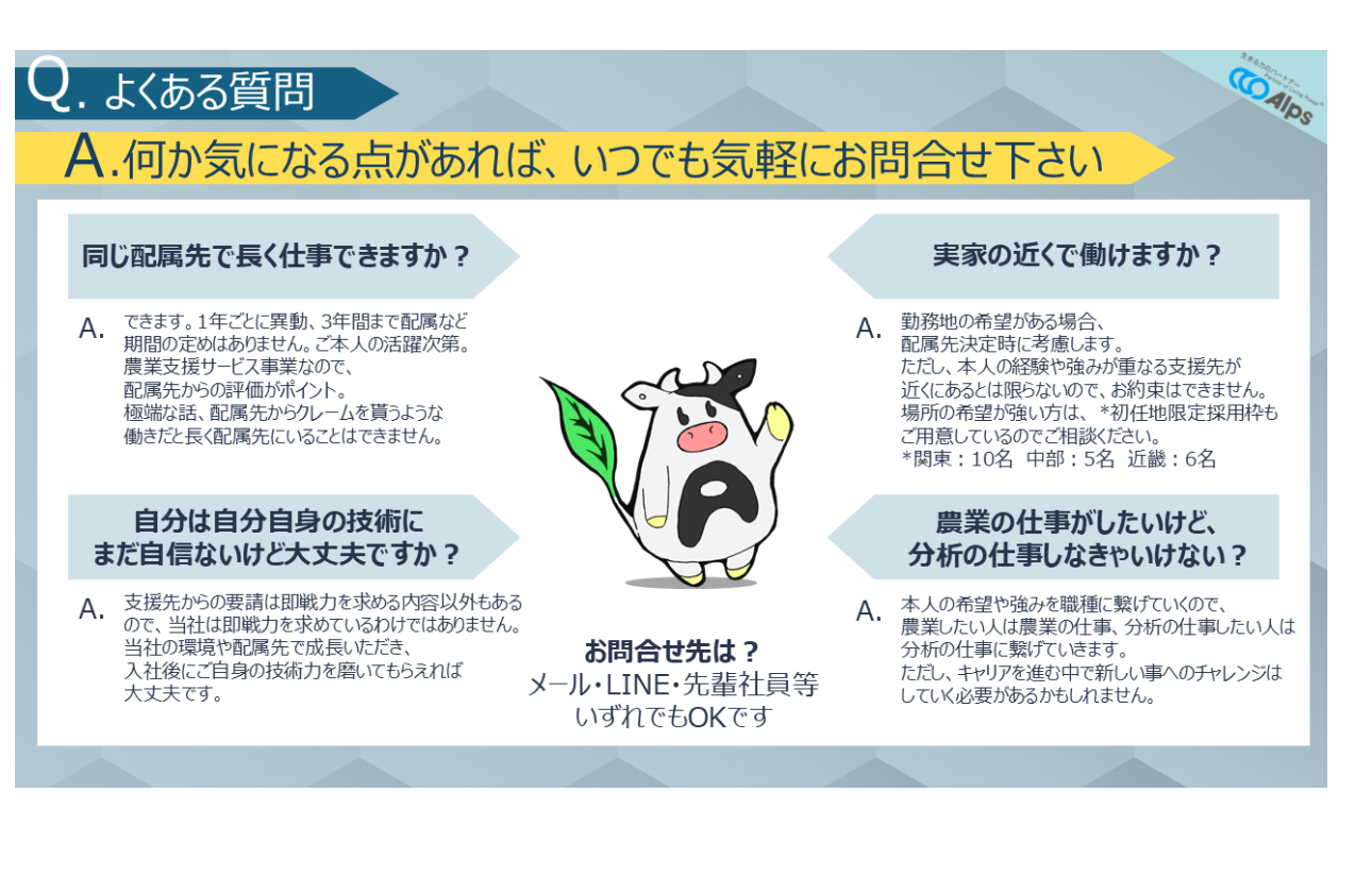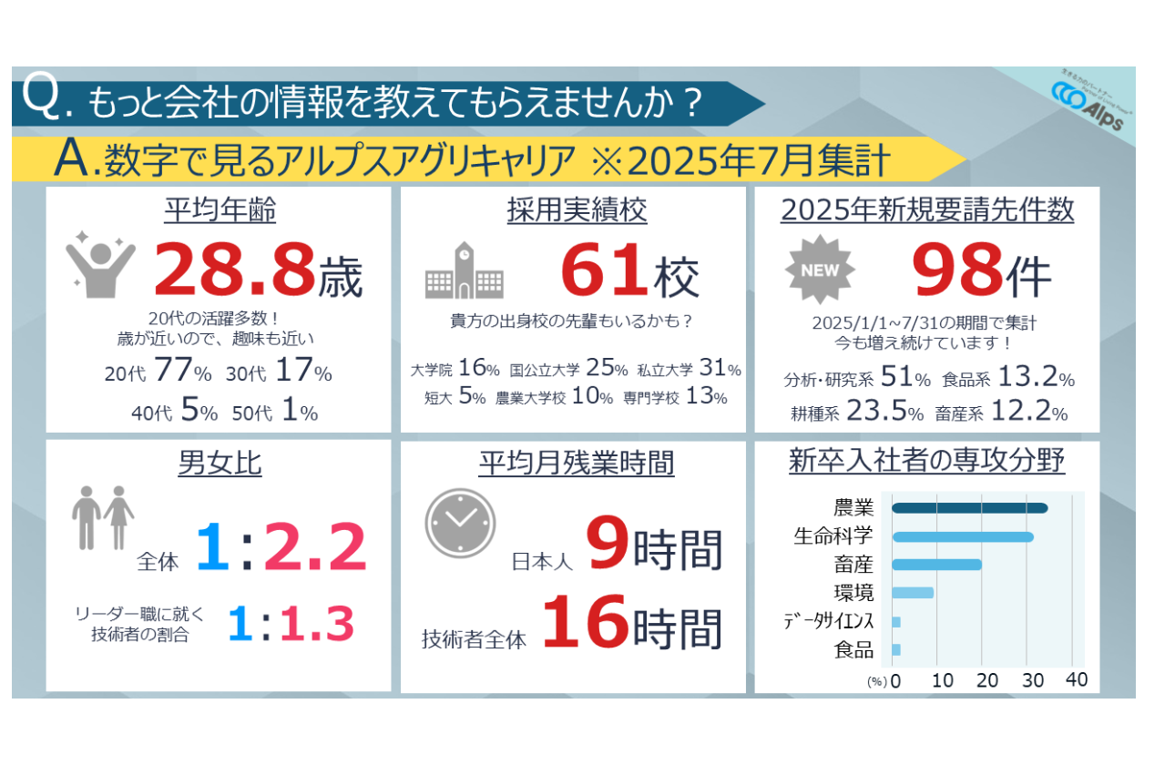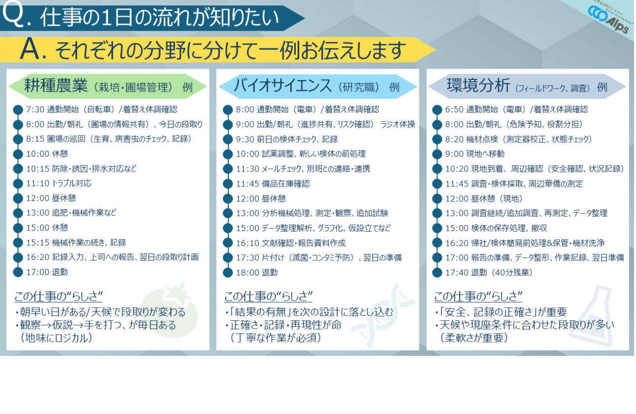 | 仕事の種類マップ | 施設栽培、品質管理、研究開発、基礎研究、応用研究、環境分析、環境調査、酪農、養豚、養鶏 |
