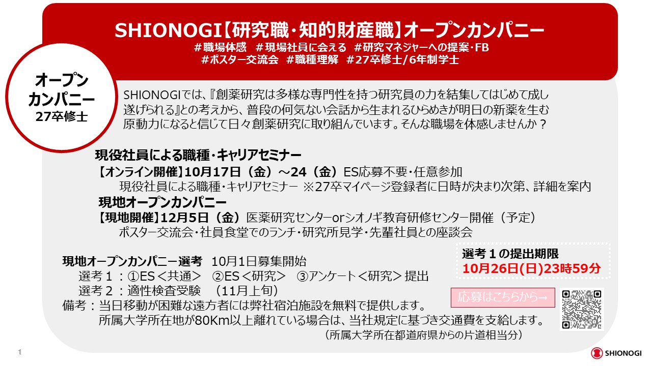 【現地開催】12月5日(金)医薬研究センターorシオノギ教育研修センター開催(予定)