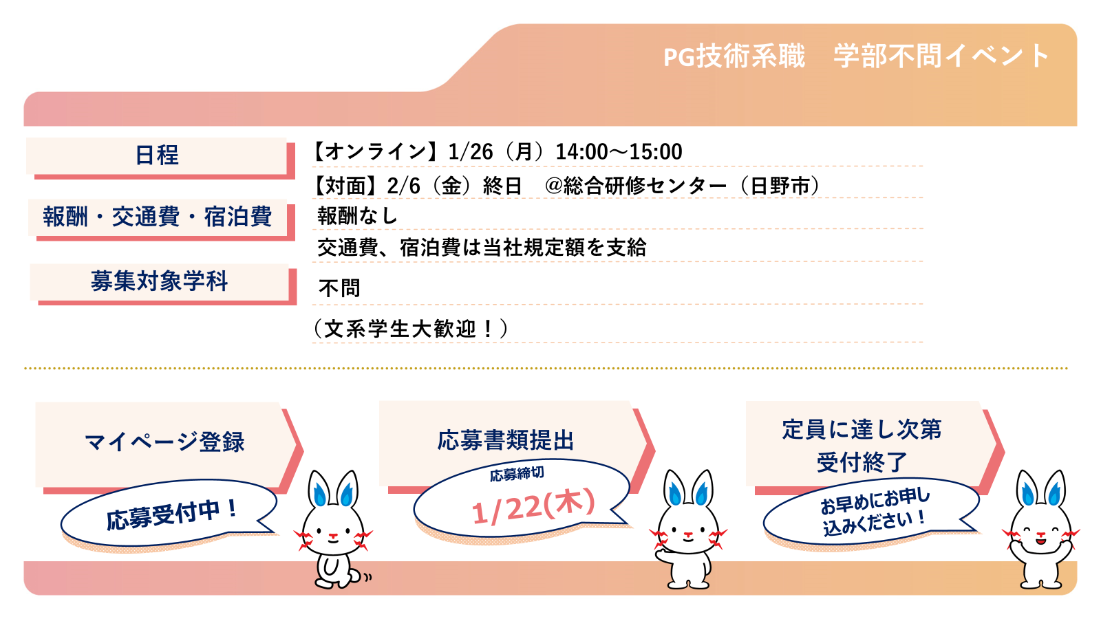 ワンキャリアにてエントリー後、企業よりマイページ等の案内がご登録のアドレスへ送付されます。企業からの連絡まで数日お待ちいただく可能性がございますこと、予めご了承くださいませ。