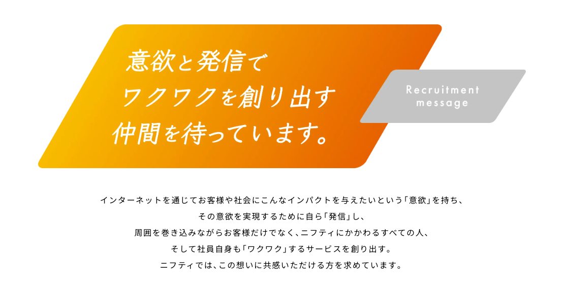 ニフティは、安定と挑戦が交差する地で、社員一人ひとりが「専門性」を極め、「新しい価値」を創造できる場所です。未来のインターネット社会を共に築く、志高い仲間を待っています。