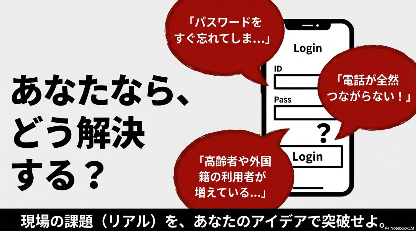 高齢者の利用者が増えている現状やパスワードを忘れがちといった声をグループでアイデアを出し合って解決していただきます。