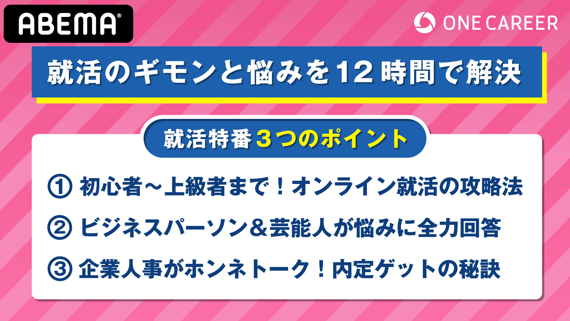 当日はテレビ&ビデオエンターテインメント「ABEMA」にて生放送し、多数出演する著名人/スペシャルゲストと「withコロナの就活」について様々な角度から徹底解説。