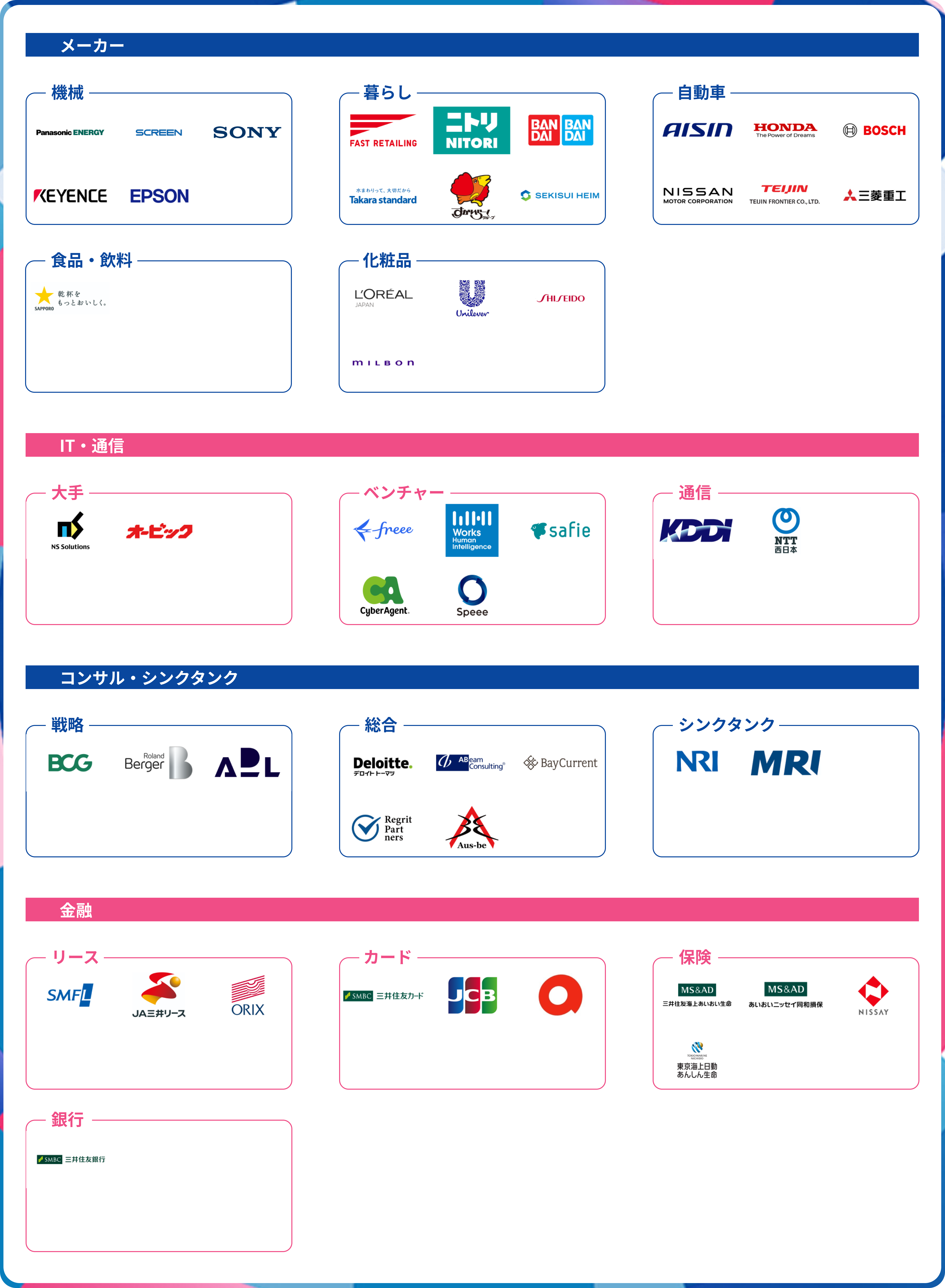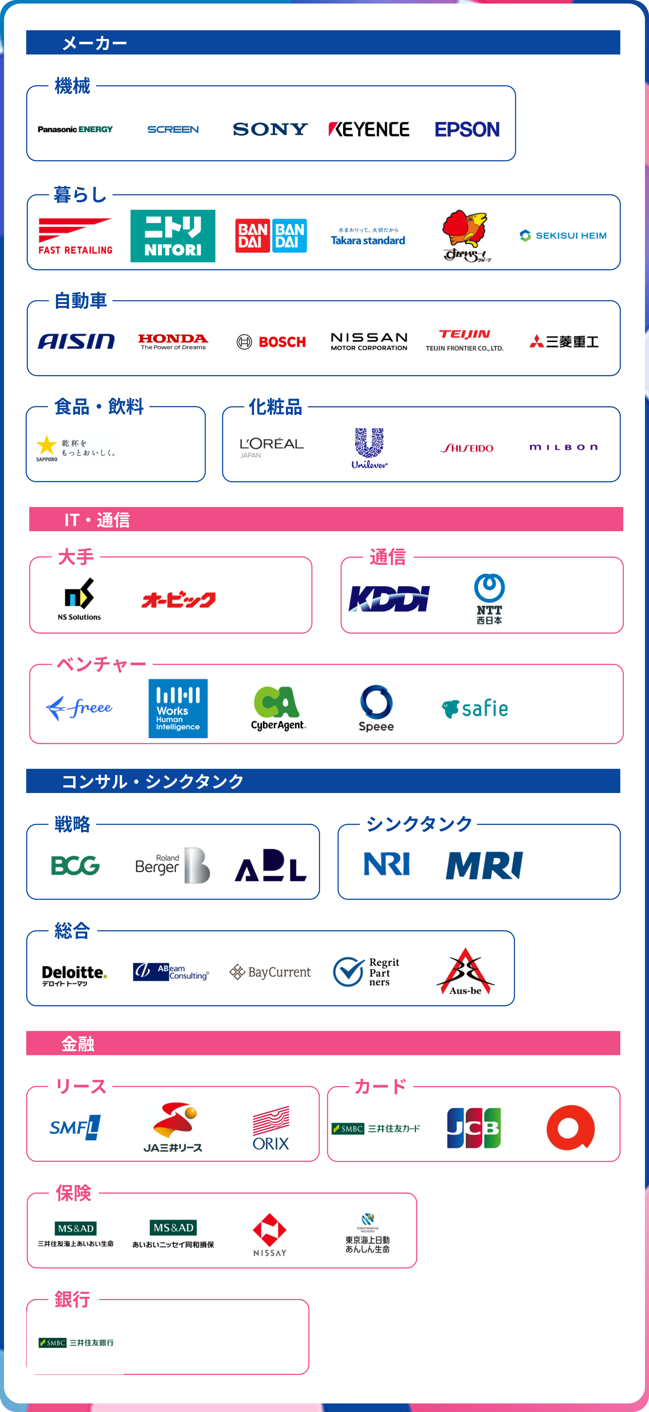 「コンサルセッション」や「ものづくりセッション」、「グローバルセッション」、「マーケティングセッション」など、業界や業種ごとにトークを展開していきます。