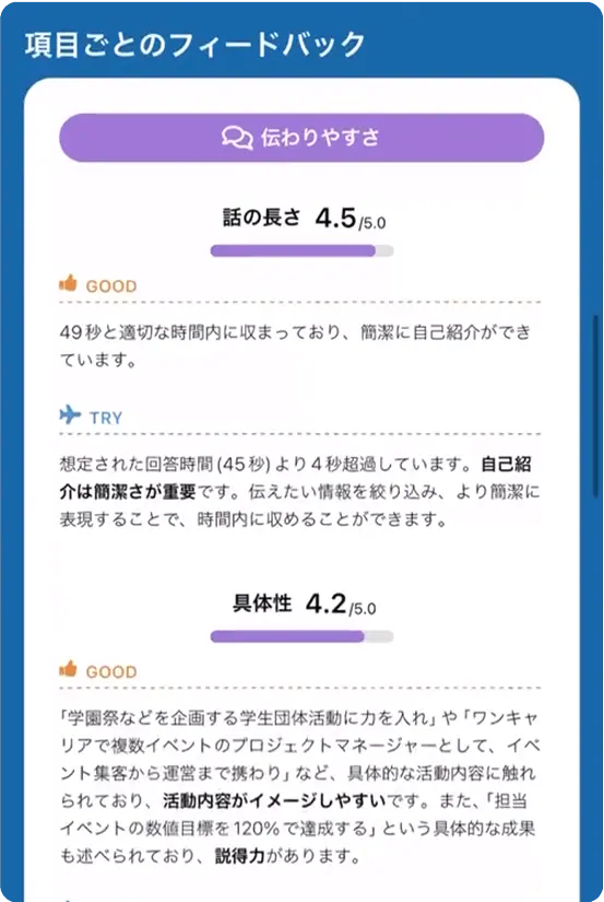 ONE CAREERに蓄積されたデータを基に回答内容を分析し、GOOD(良かった点)とTRY(改善点)を提示。また、話す間やスピードといった側面でも評価し、面接で必要となる総合力についてフィードバックします。