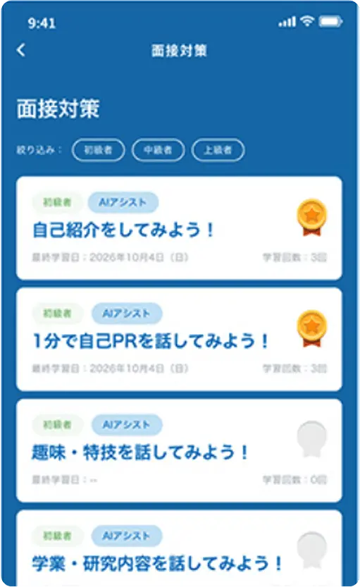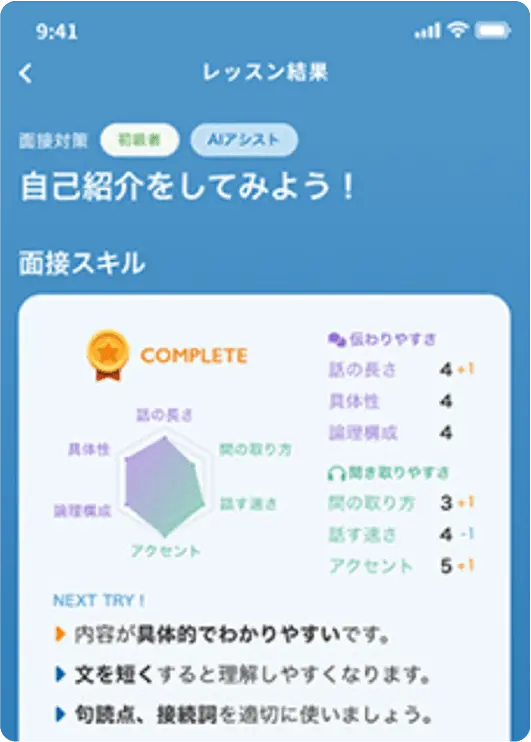 面接スキルについて「伝わりやすさ」や「聞き取りやすさ」の観点で項目をスコア化し、GOOD/TRYでフィードバックします。あなたの回答やフィードバック内容はレッスンの履歴として残るため、継続的なトレーニングと改善に取り組めます。