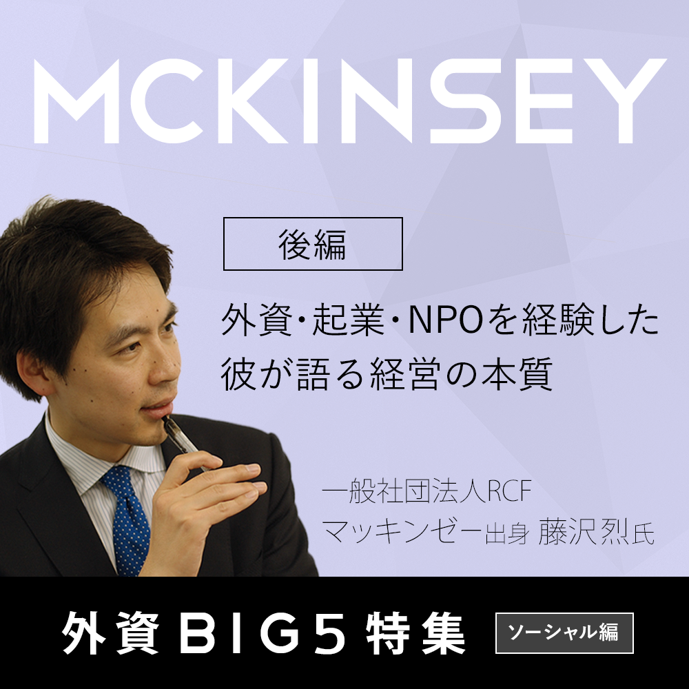 「外資BIG5特集」の第2弾は、外資系戦略コンサルティングファーム、マッキンゼー・アンド・カンパニーを経て、現在東北の復興支援に軸を置く、一般社団法人RCF(※1)代表 藤沢烈氏へのインタビュー...