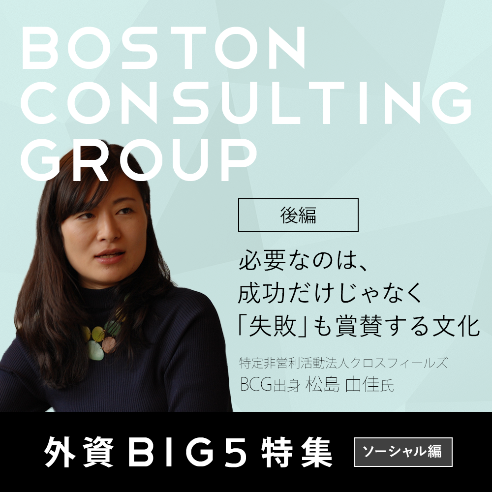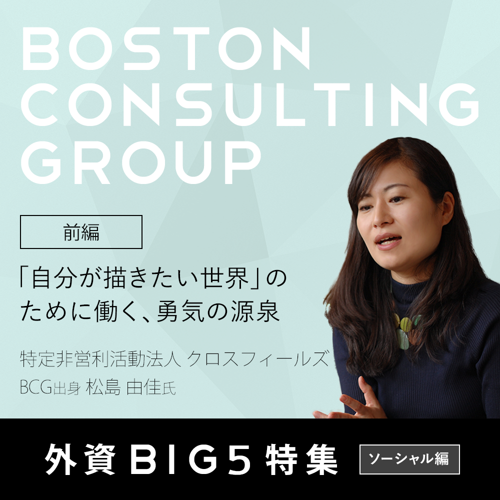 「外資BIG5特集」の第3弾は、NPO法人クロスフィールズ(※1)共同創業者・副代表である、松島由佳氏へのインタビュー。前編では、彼女が「今でも大好きな会社」と話すボストン コンサルティング グ... -